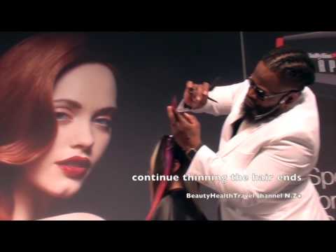 Section the hair in diamond shapes at the top crown area and secure each section with rubber bands. Start with cutting the bottom hair straight across using hair clippers, then elevate the same section of the hair grabbing subsections and layer the hair with scissors. Use thinning shears to soften the hair edges. Remove the rubber band from the previously isolated hair and cut at 90-degree elevation to add unique layers to the hair. Style the hair as desired. The haircut is done with hair clippers, scissors and thinning shears. This hair cutting video is for cosmetologists, beauty school students, salon professionals, and hairdressers. Sound Effects from iMovie: travel, bright, simple, modern. Guest artist from Reggie, video by BeautyHealthTravel channel N.Z.